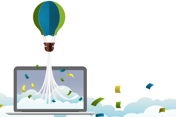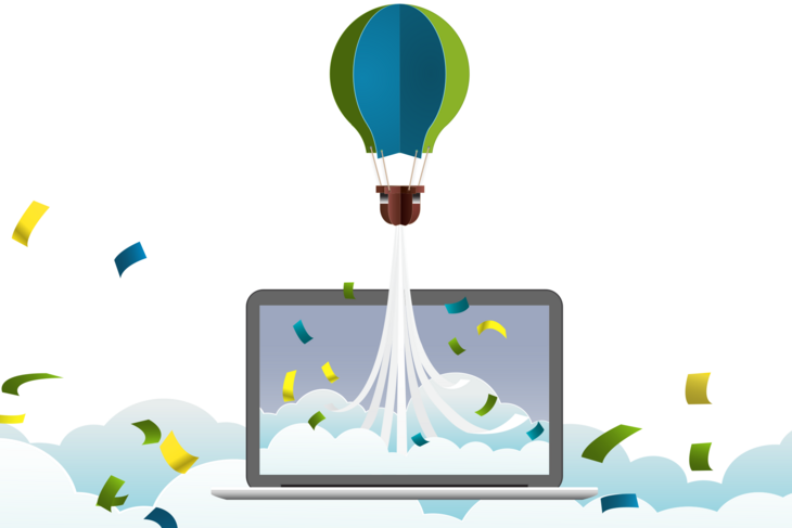 Ein Ballon steigt aus einem Laptop auf. Die Illustration ist in Grüntönen gehalten.