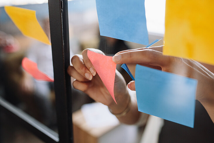 Hände befestigen bunte Haftnotizen an einer Glaswand während eines Meetings