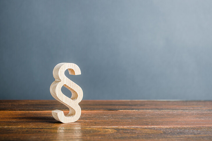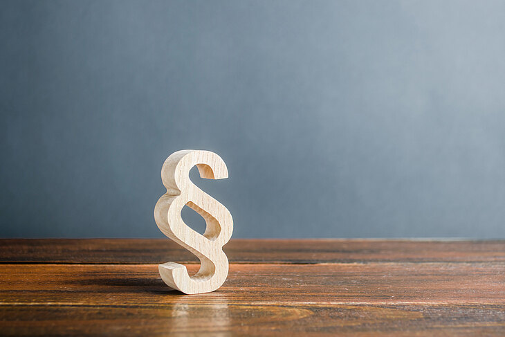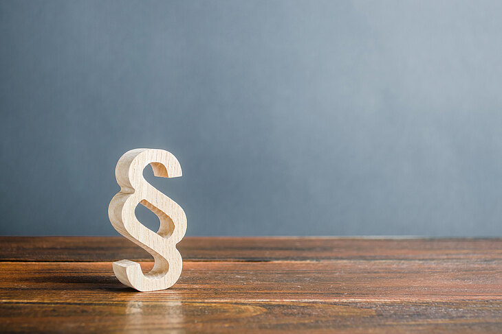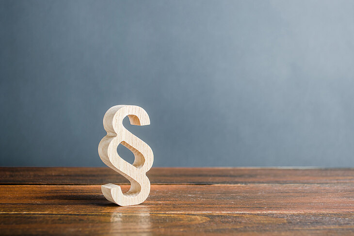Ein hölzernes Paragraphenzeichen steht auf einem Holztisch vor einer grauen Wand